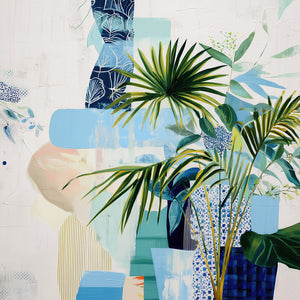 Intertwined foliage and cool blue hues create a textured, ethereal garden within a painted dreamscape.