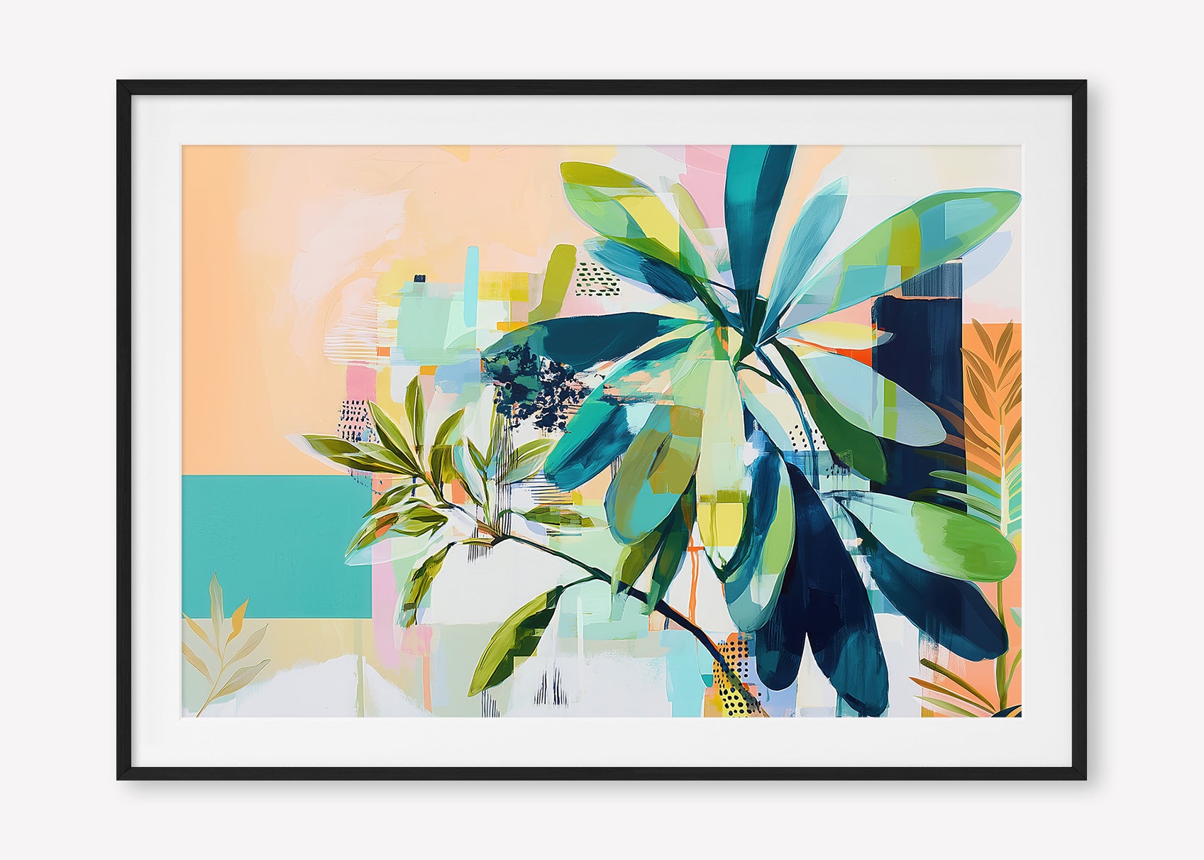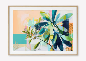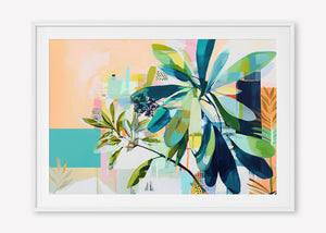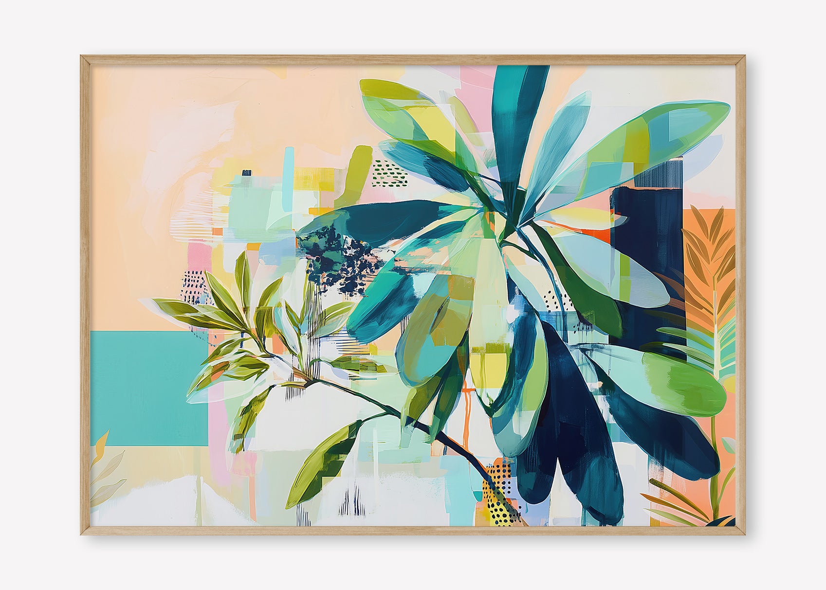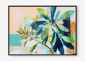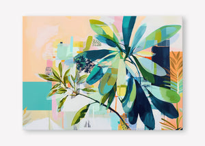 Layers of translucent colour and bold foliage forms create a dreamy, textured botanical exploration.