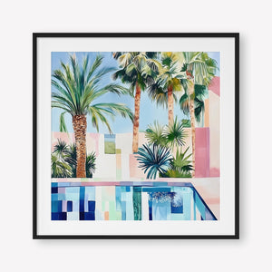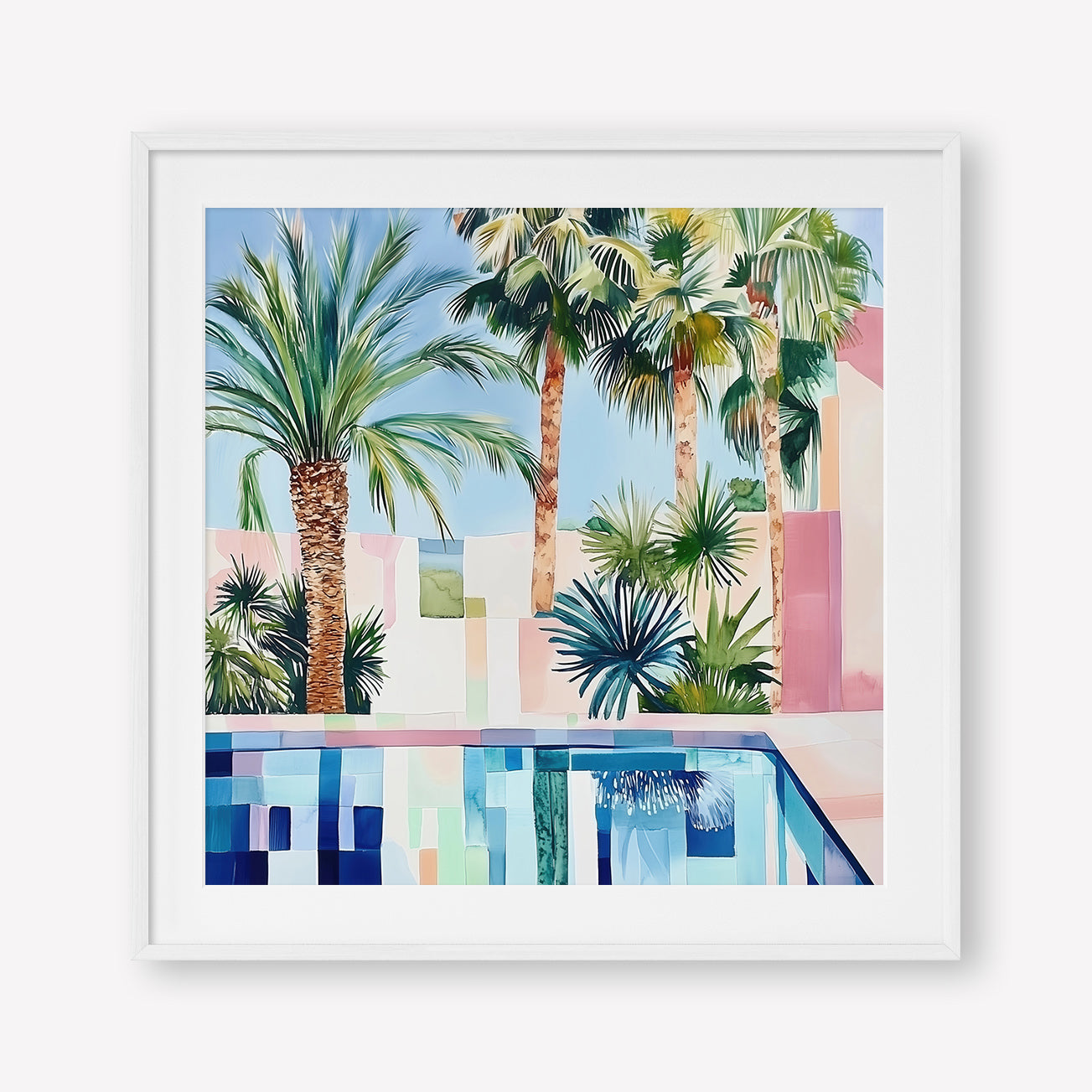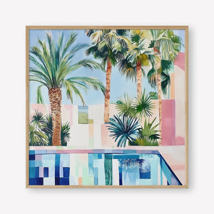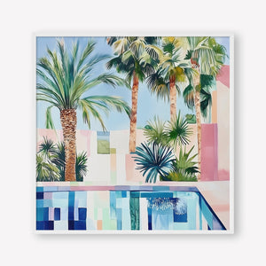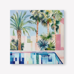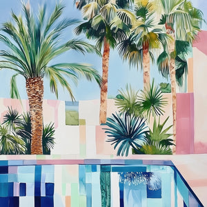 Palm trees and shimmering water blend in soft hues, evoking a tranquil and sun-drenched escape.
