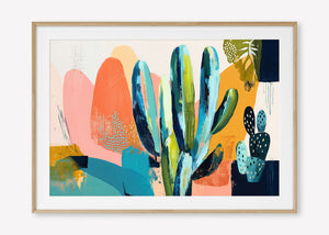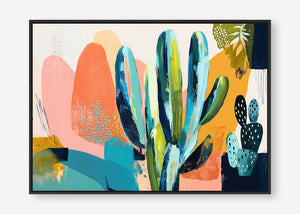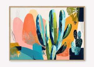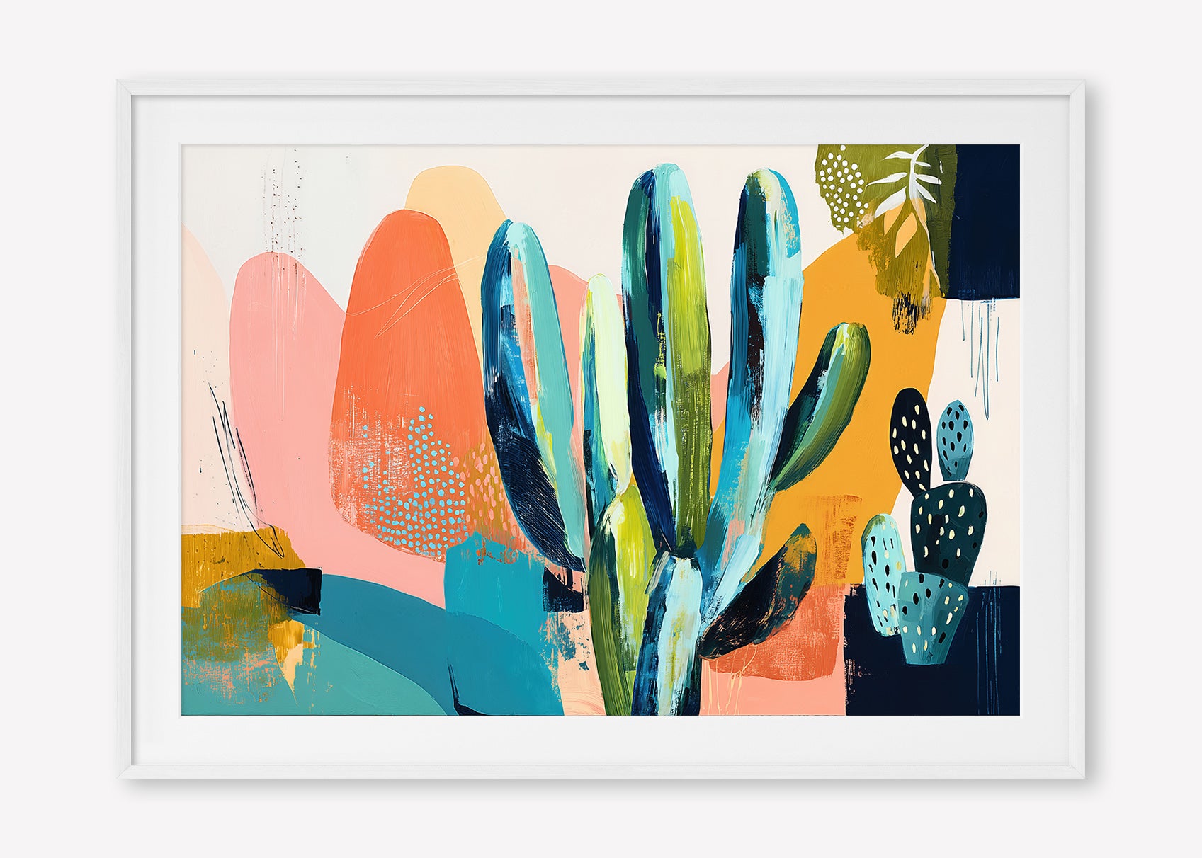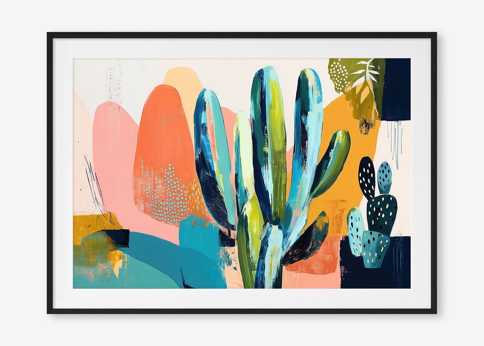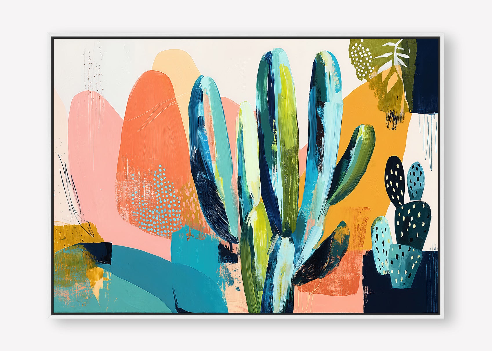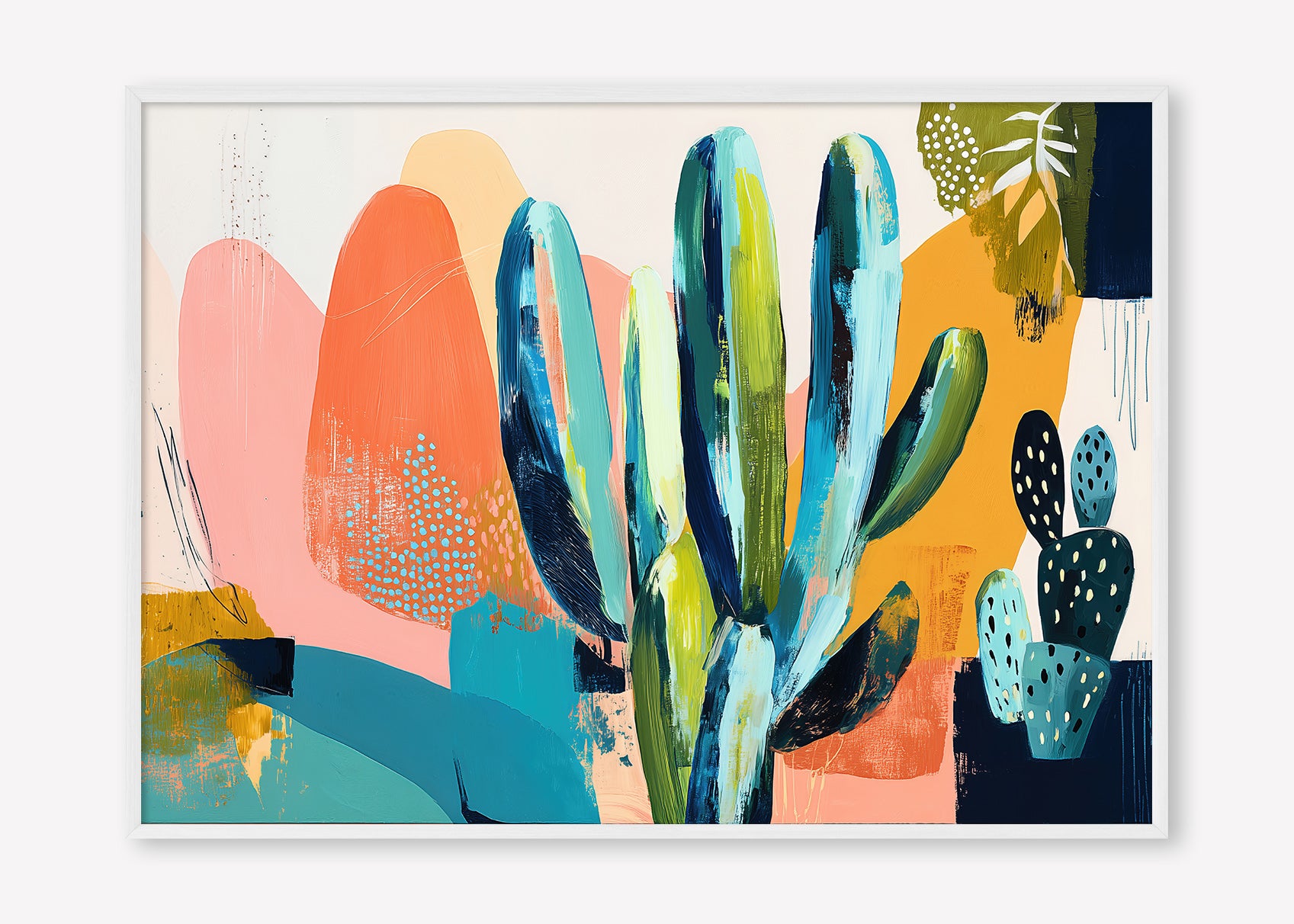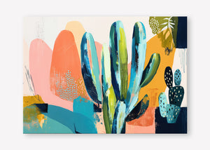 Bold brushstrokes form stylized cacti against a vibrant, textured backdrop, a painted ode to arid beauty.