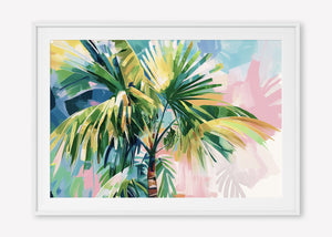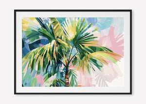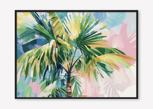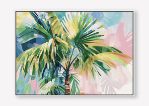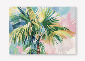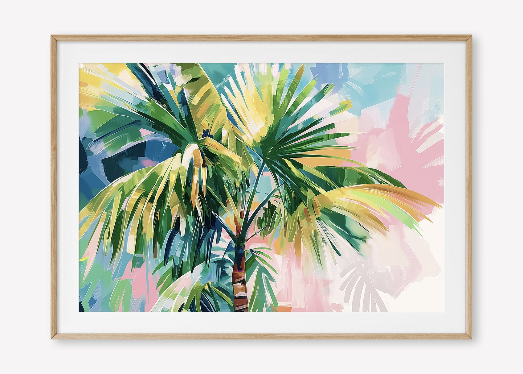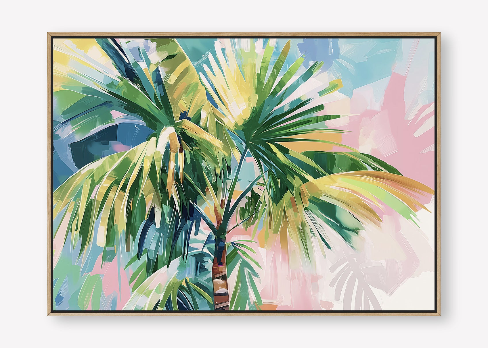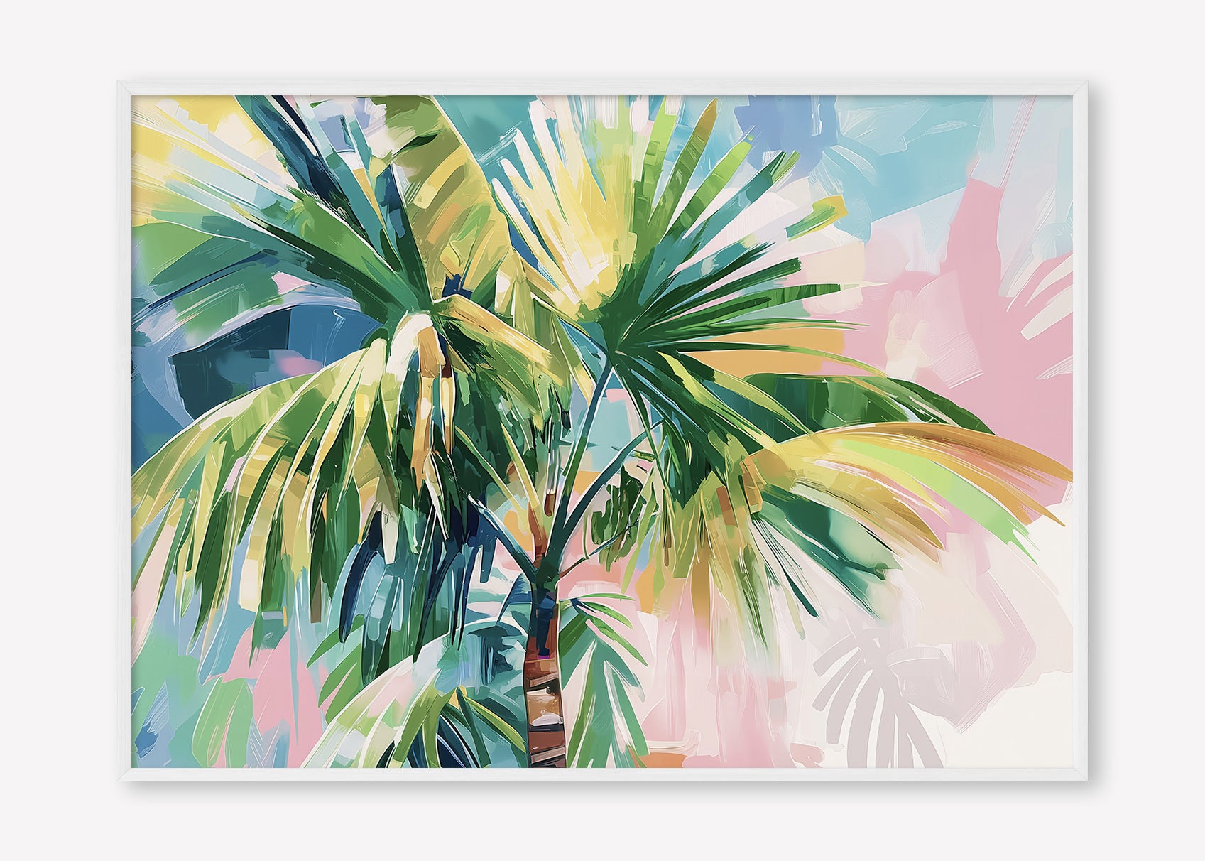 Vibrant brushstrokes capture the light filtering through stylized palm leaves against a soft, dreamy sky.