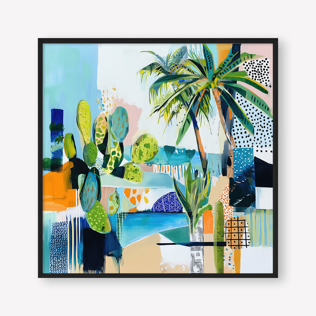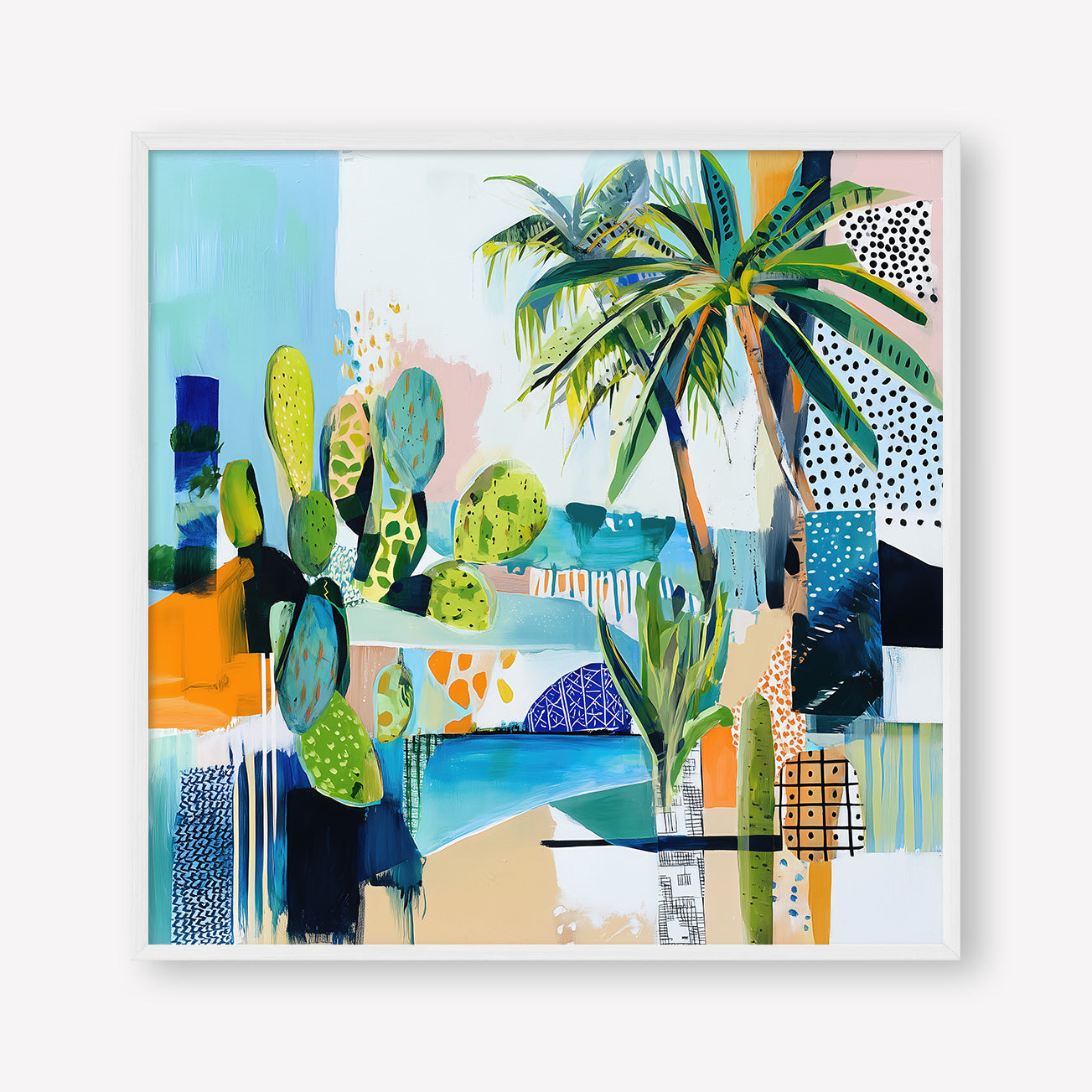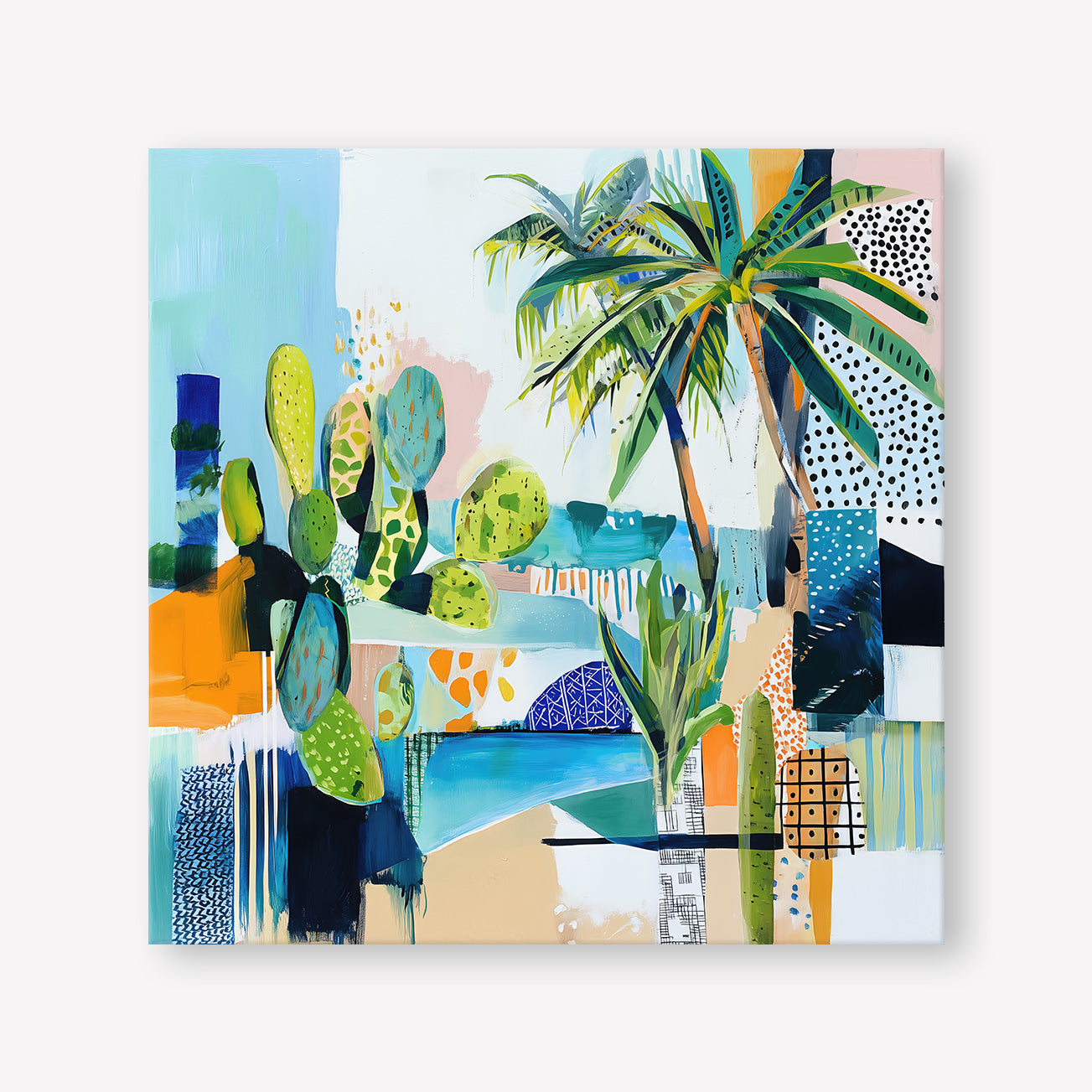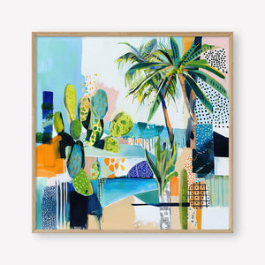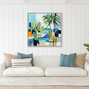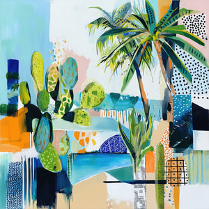 Sun-drenched palms and abstract sea tones merge in a vibrant composition, hinting at a Mediterranean garden by the shore.