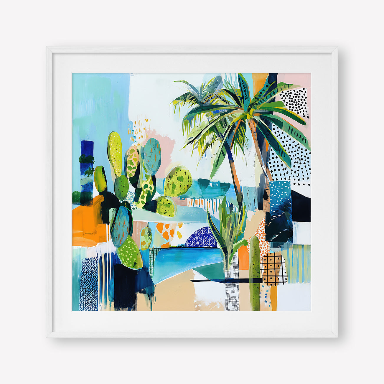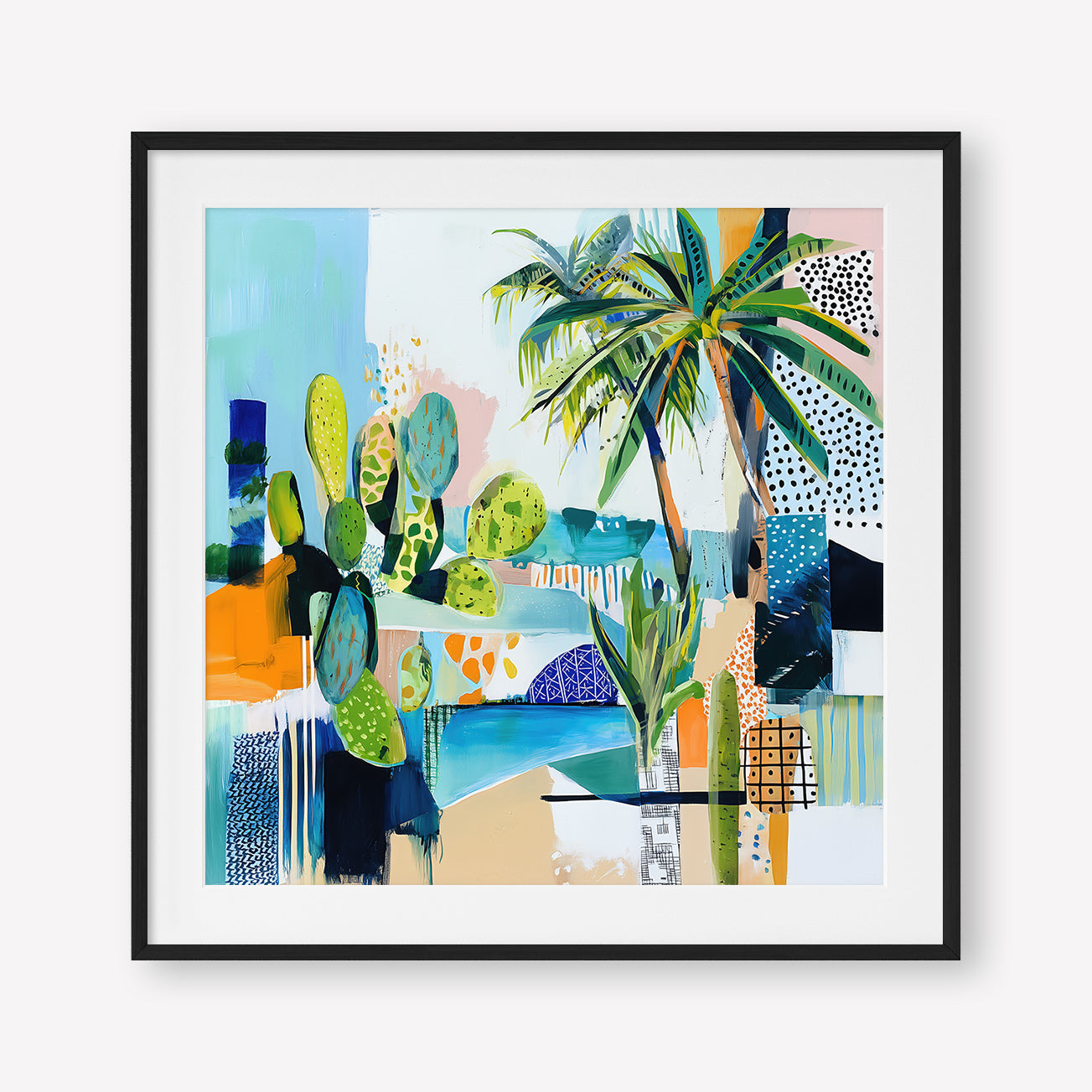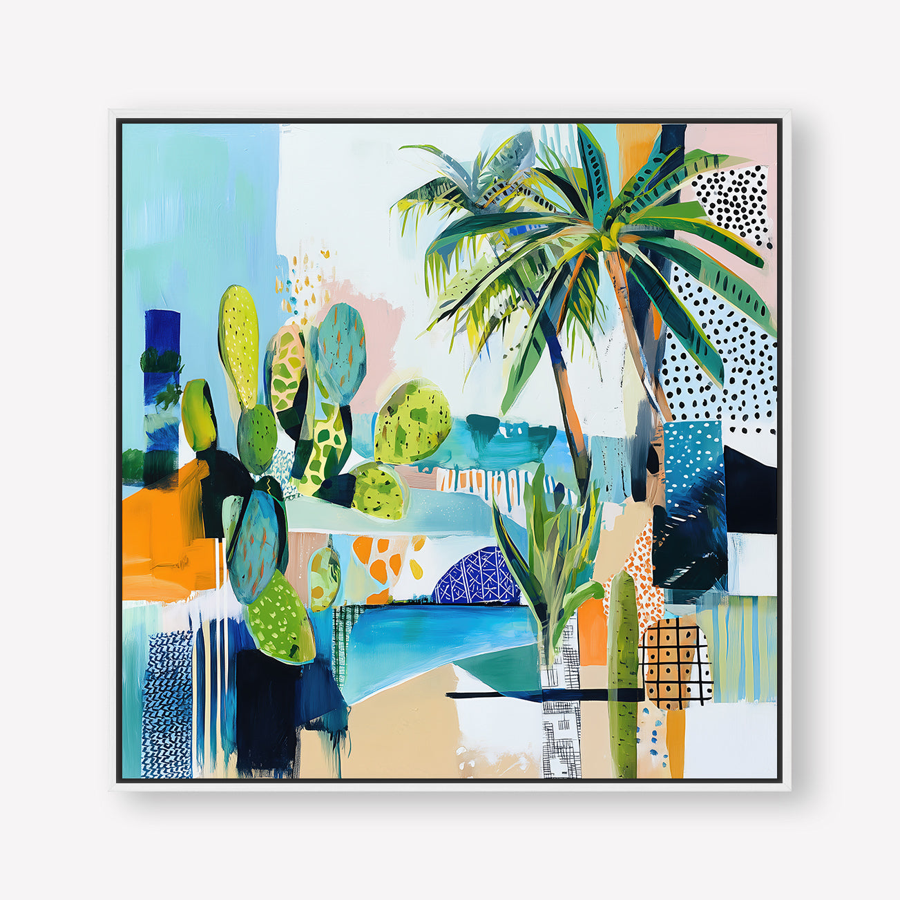 Sun-drenched palms and abstract sea tones merge in a vibrant composition, hinting at a Mediterranean garden by the shore.