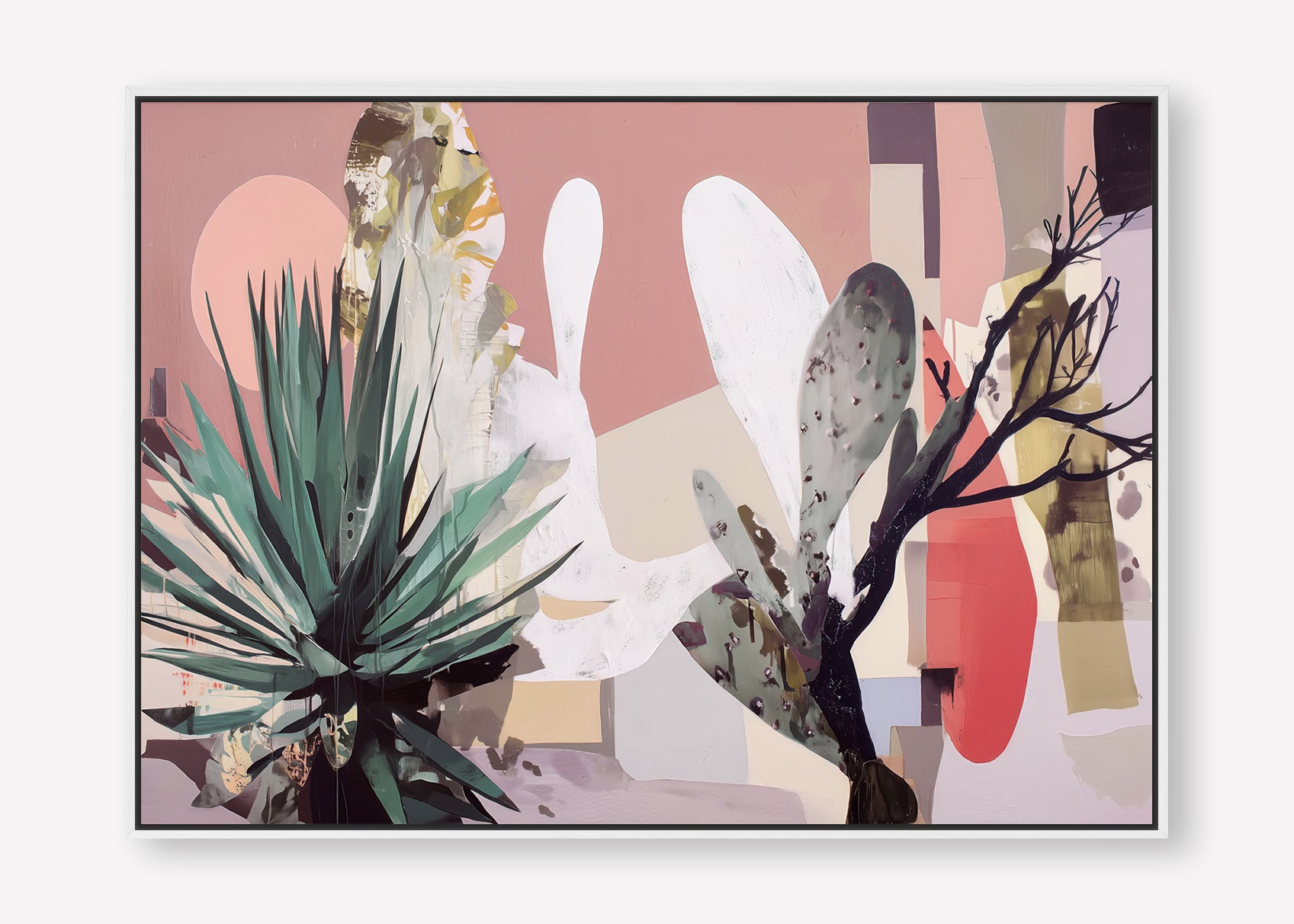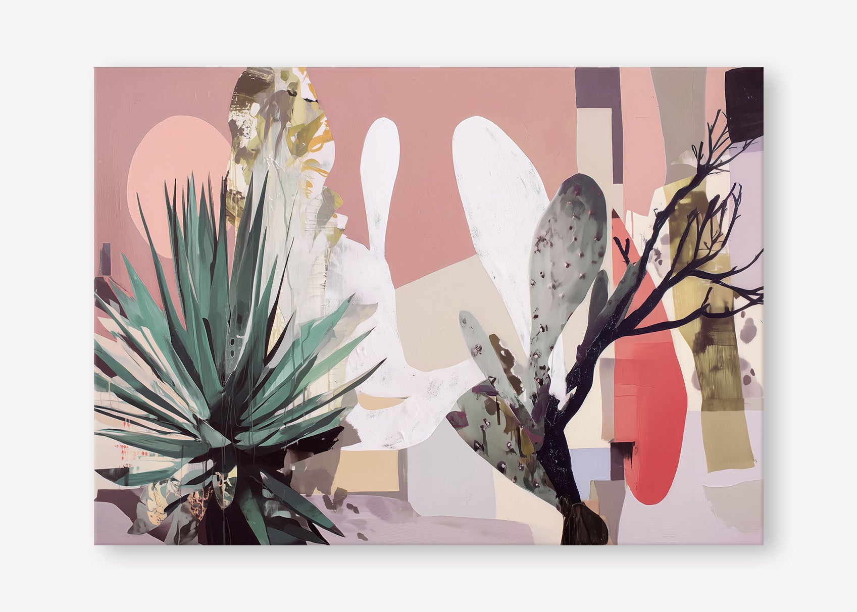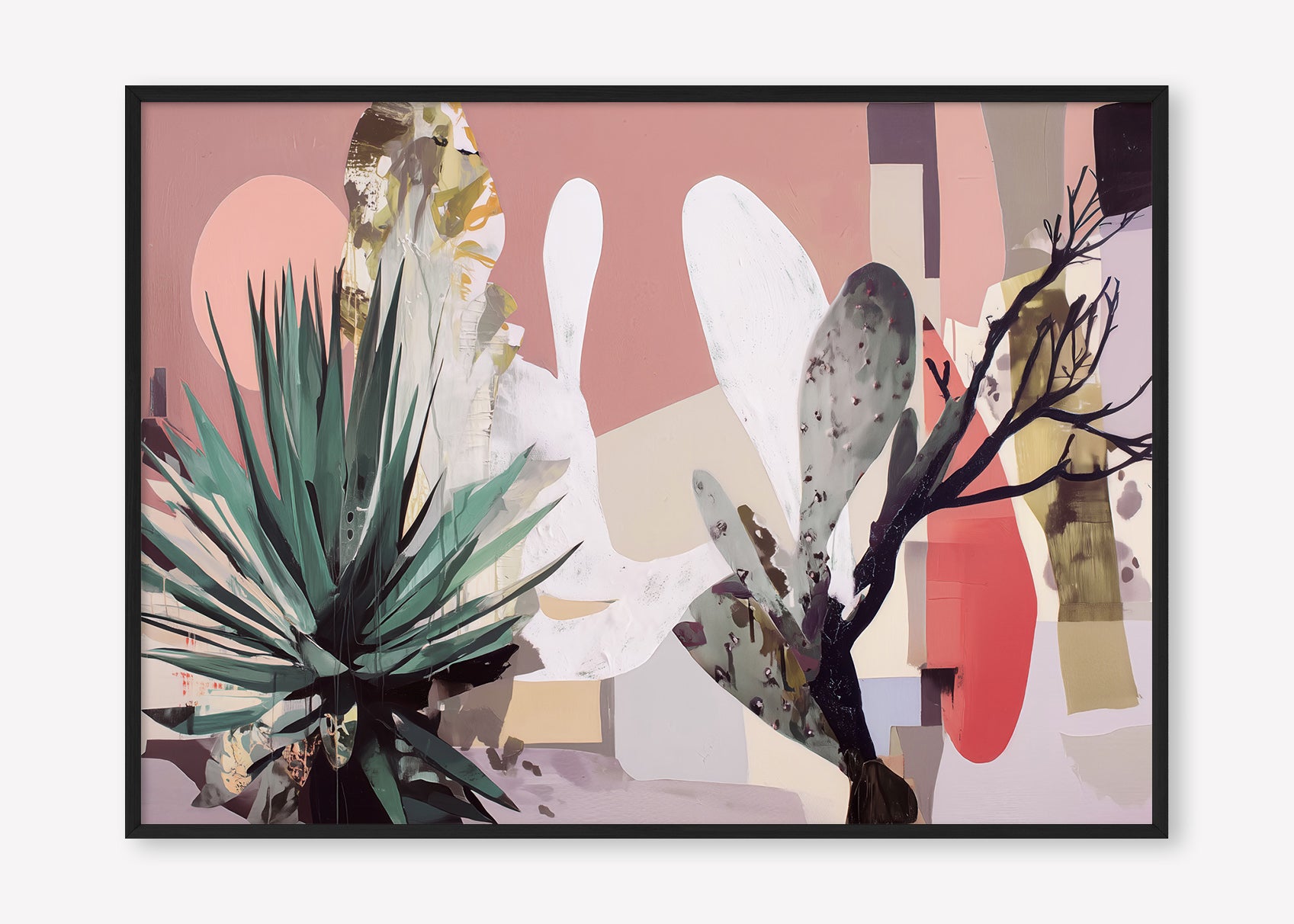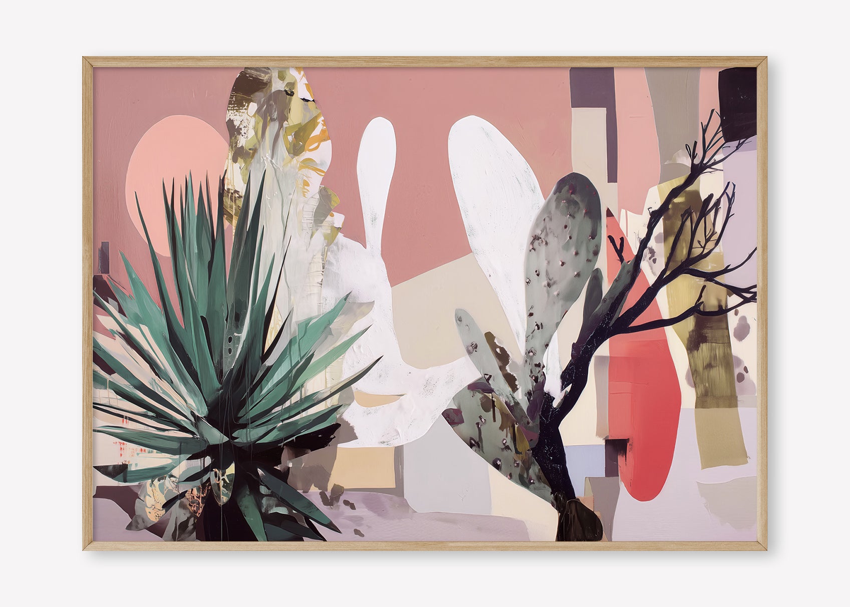A teal succulent and sparse branches stand against warm hues and a setting sun, a serene desert dreamscape.