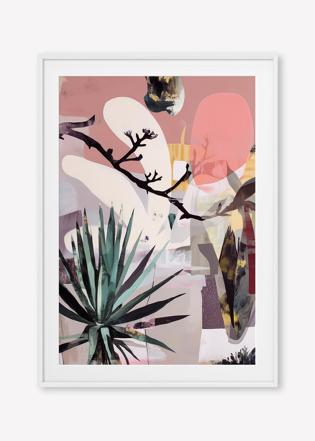 A teal succulent and sparse branches stand against warm hues and a setting sun, a serene desert dreamscape.