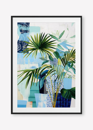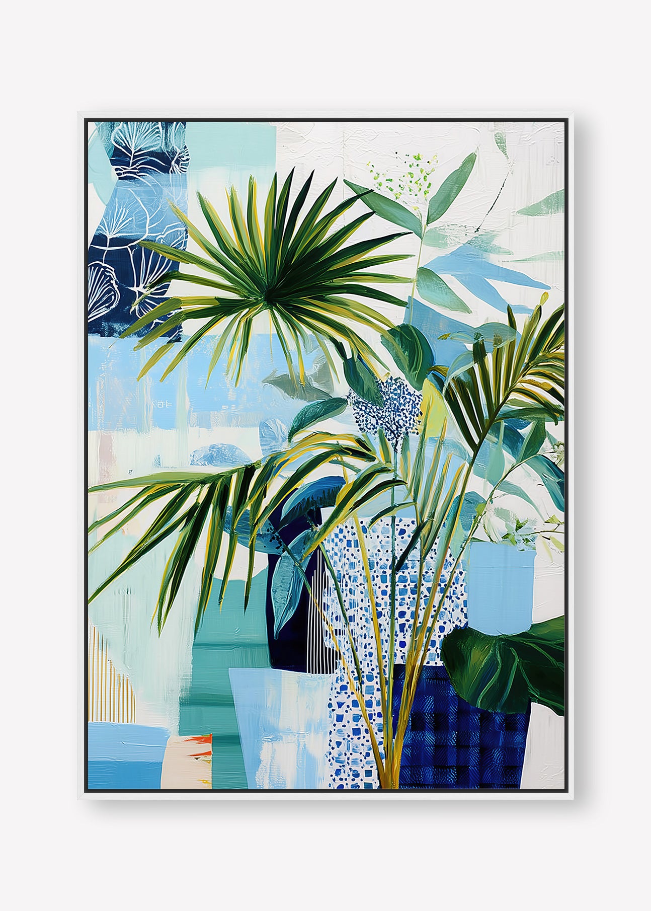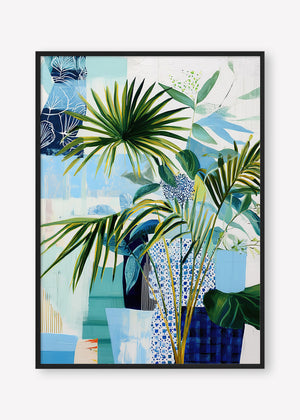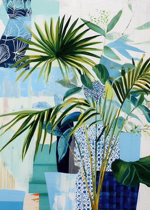 Intertwined foliage and cool blue hues create a textured, ethereal garden within a painted dreamscape.