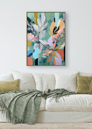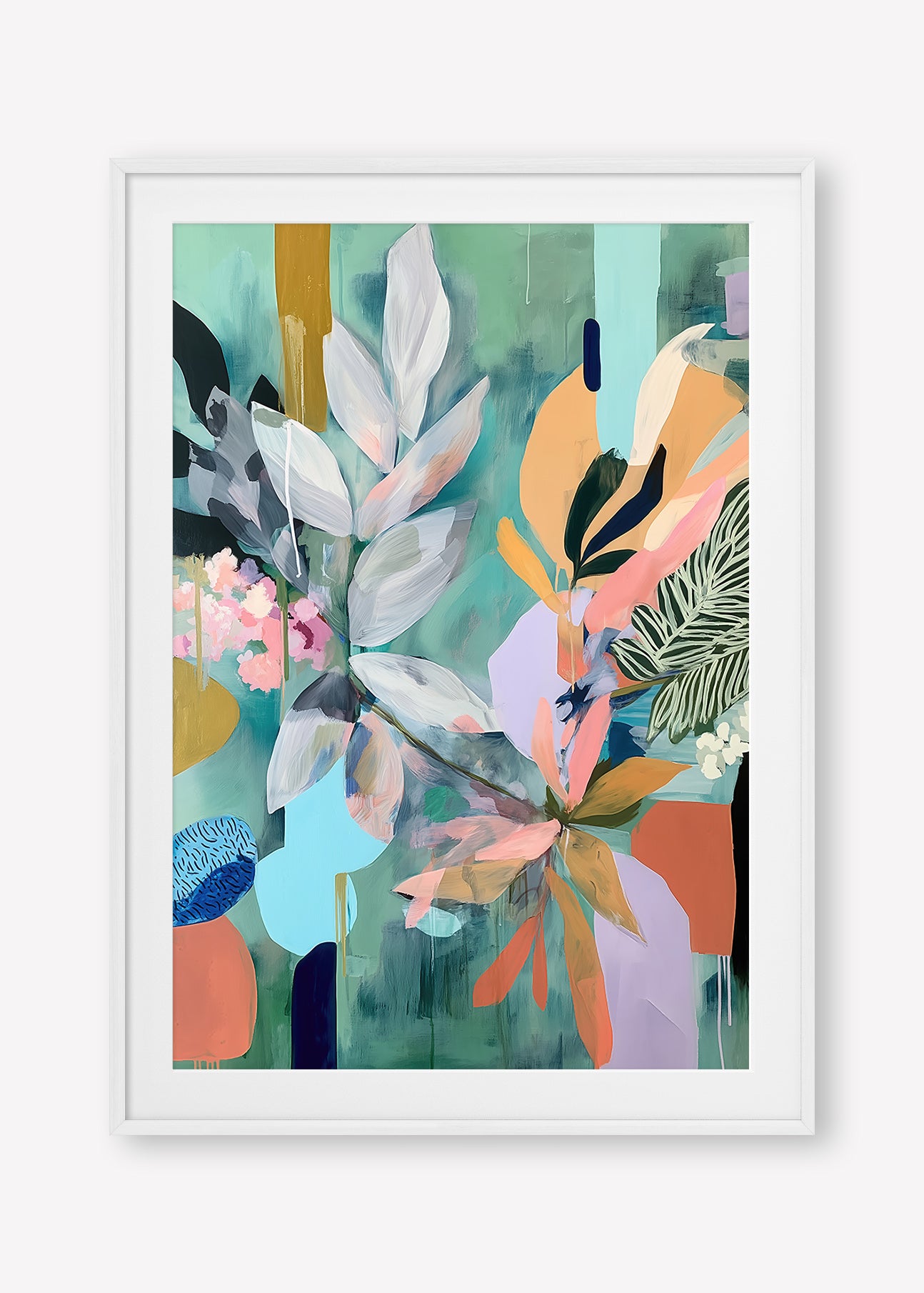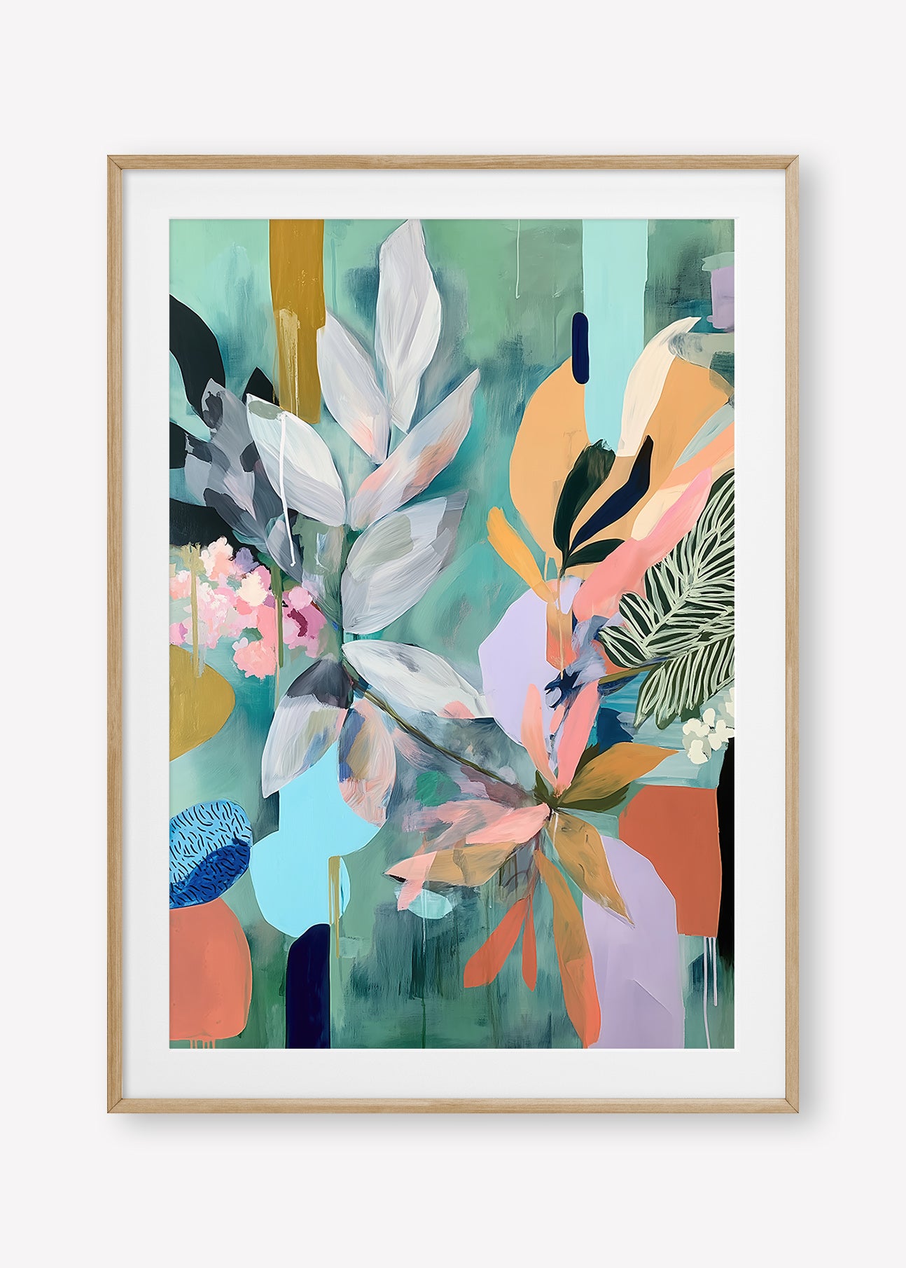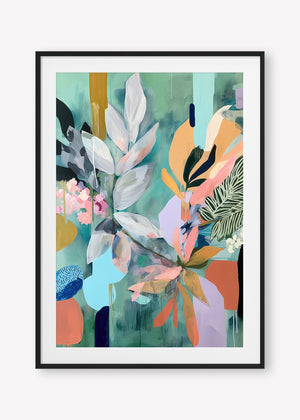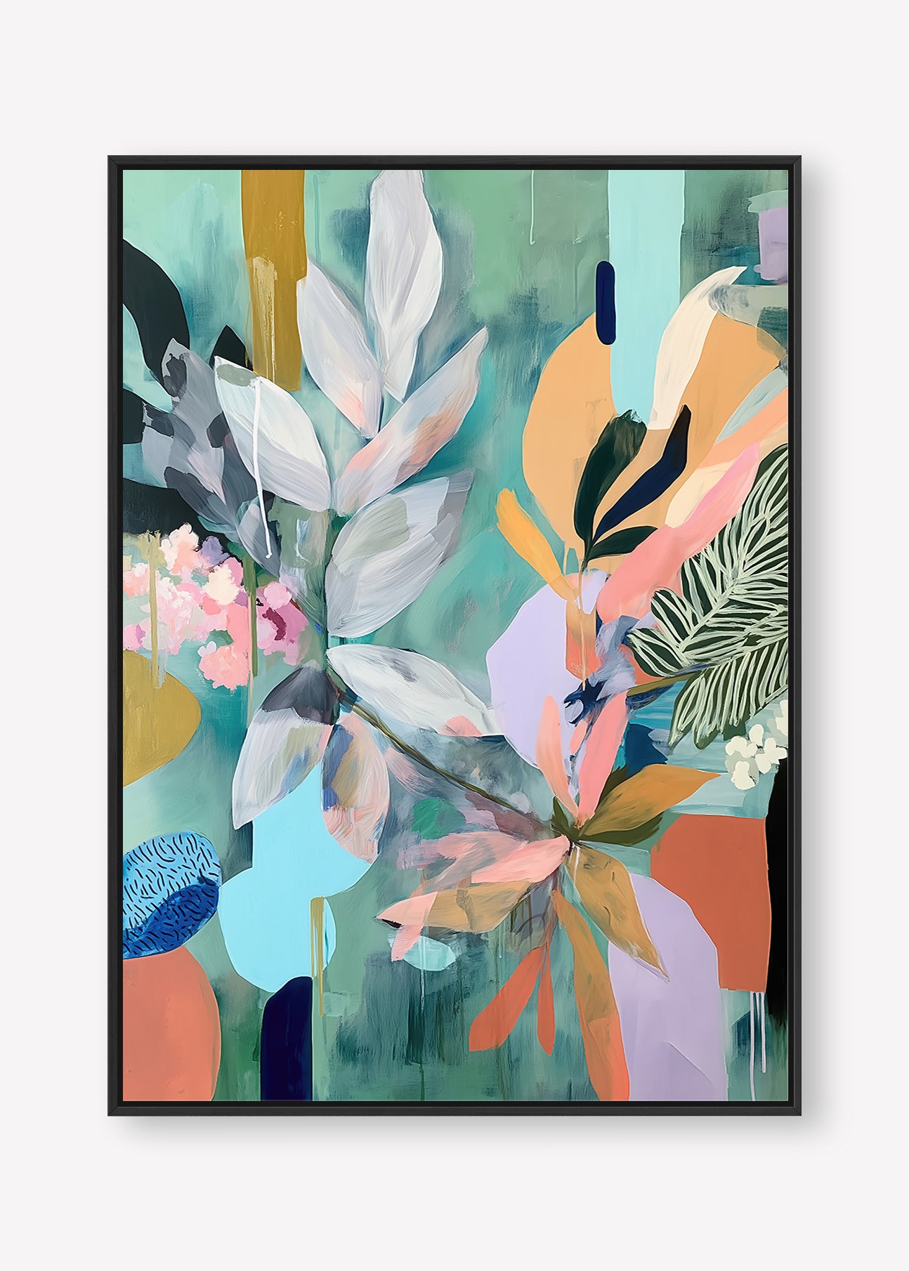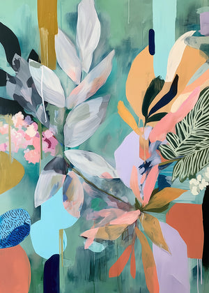 Overlapping botanical forms in muted and bold tones create a textured, whispering garden within the frame.