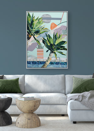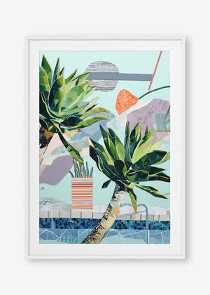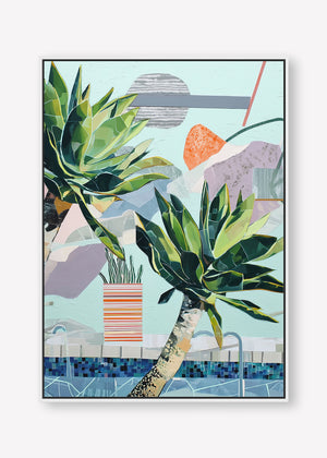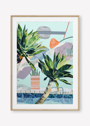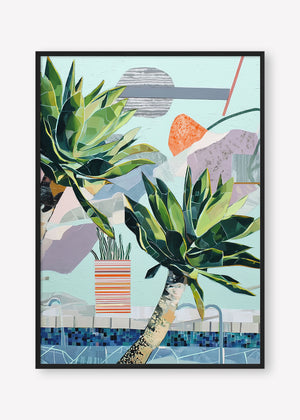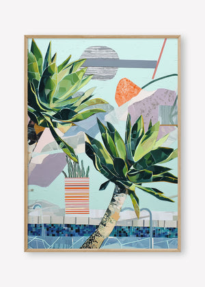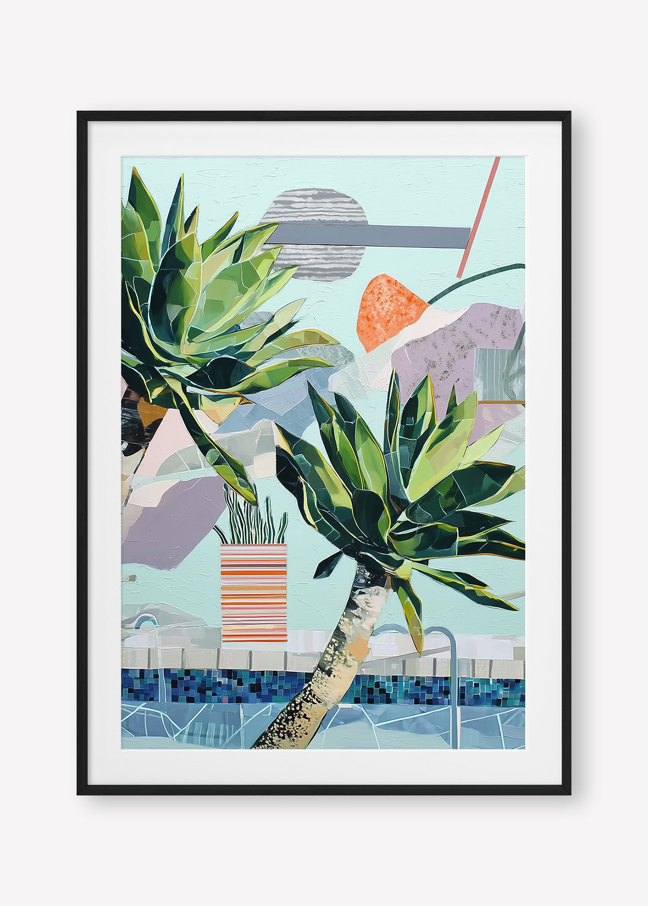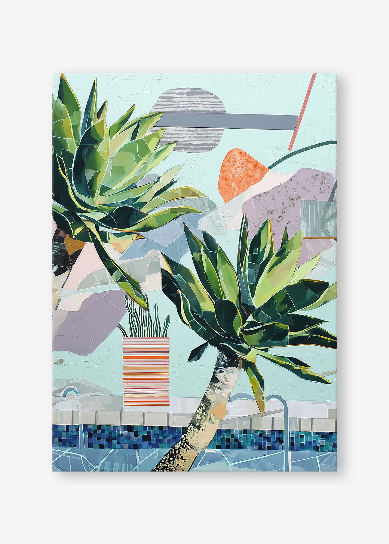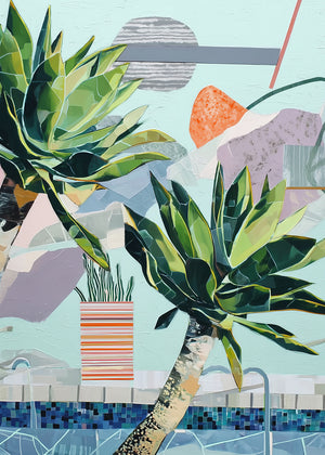 Stylized succulents lean over a mosaic pool, amidst abstract shapes in a serene, sun-drenched composition.