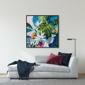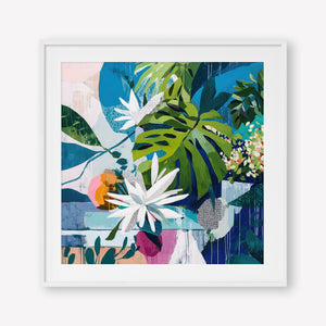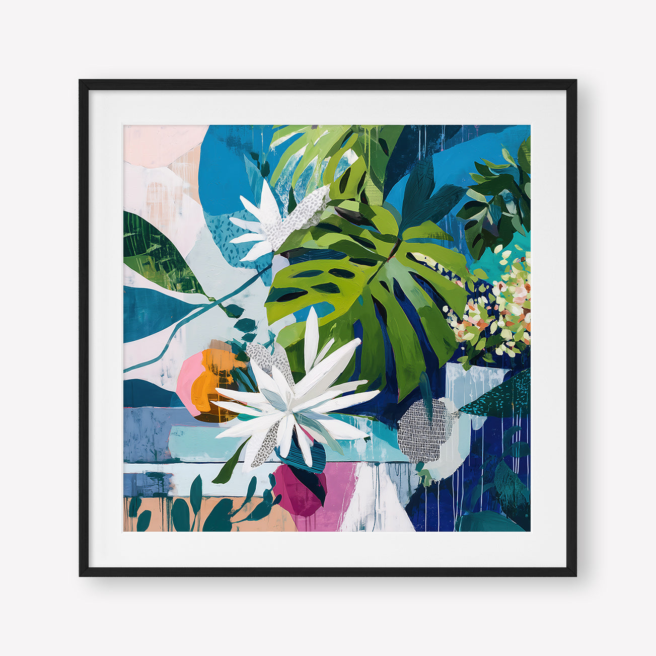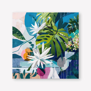 Lush green foliage and vibrant white blossoms explode across a textured canvas in a symphony of tropical hues.
