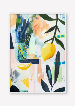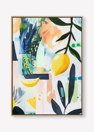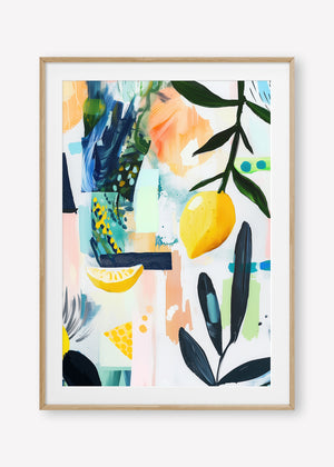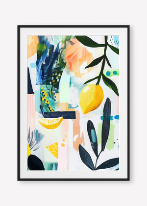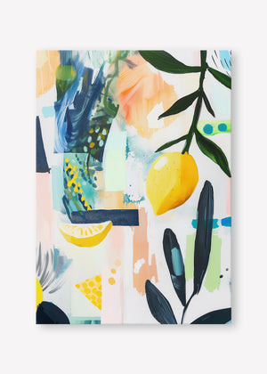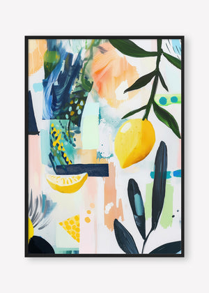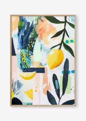 Bright lemons and dark leaves dance amidst a playful arrangement of colourful abstract brushstrokes.