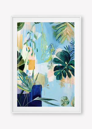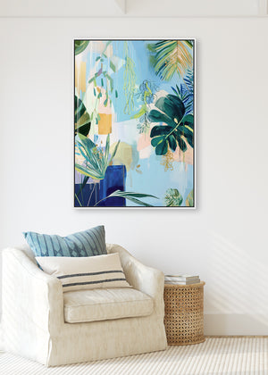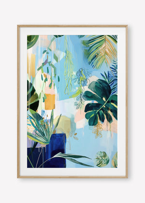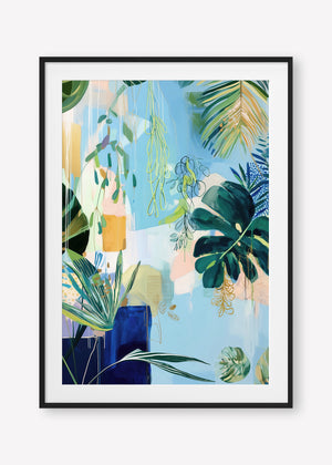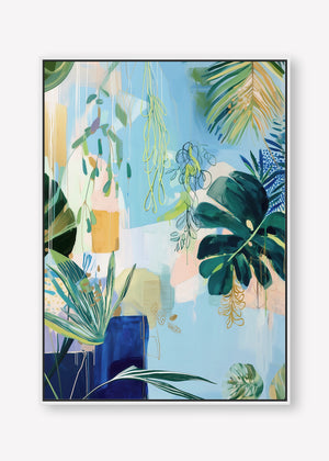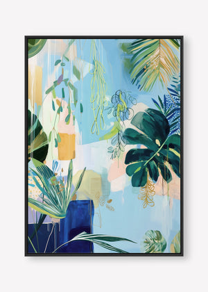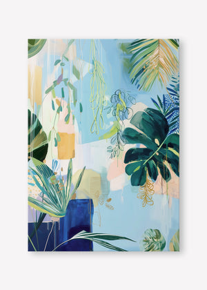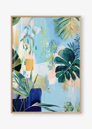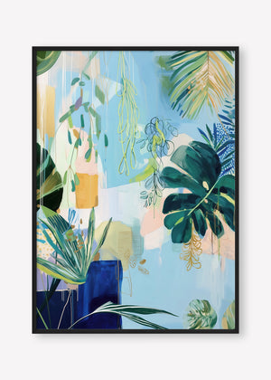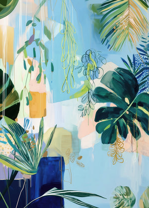 Lush painted foliage in vibrant blues and greens merges with abstract washes, suggesting a vibrant, flowing jungle.