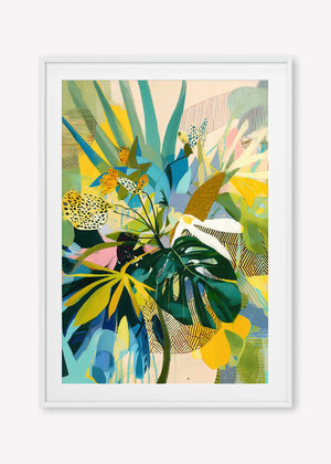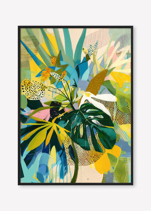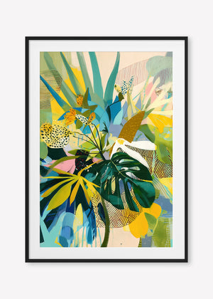 Bold leaves and energetic patterns pulse with vibrant hues, a painterly rhythm of a lush, imagined jungle.
