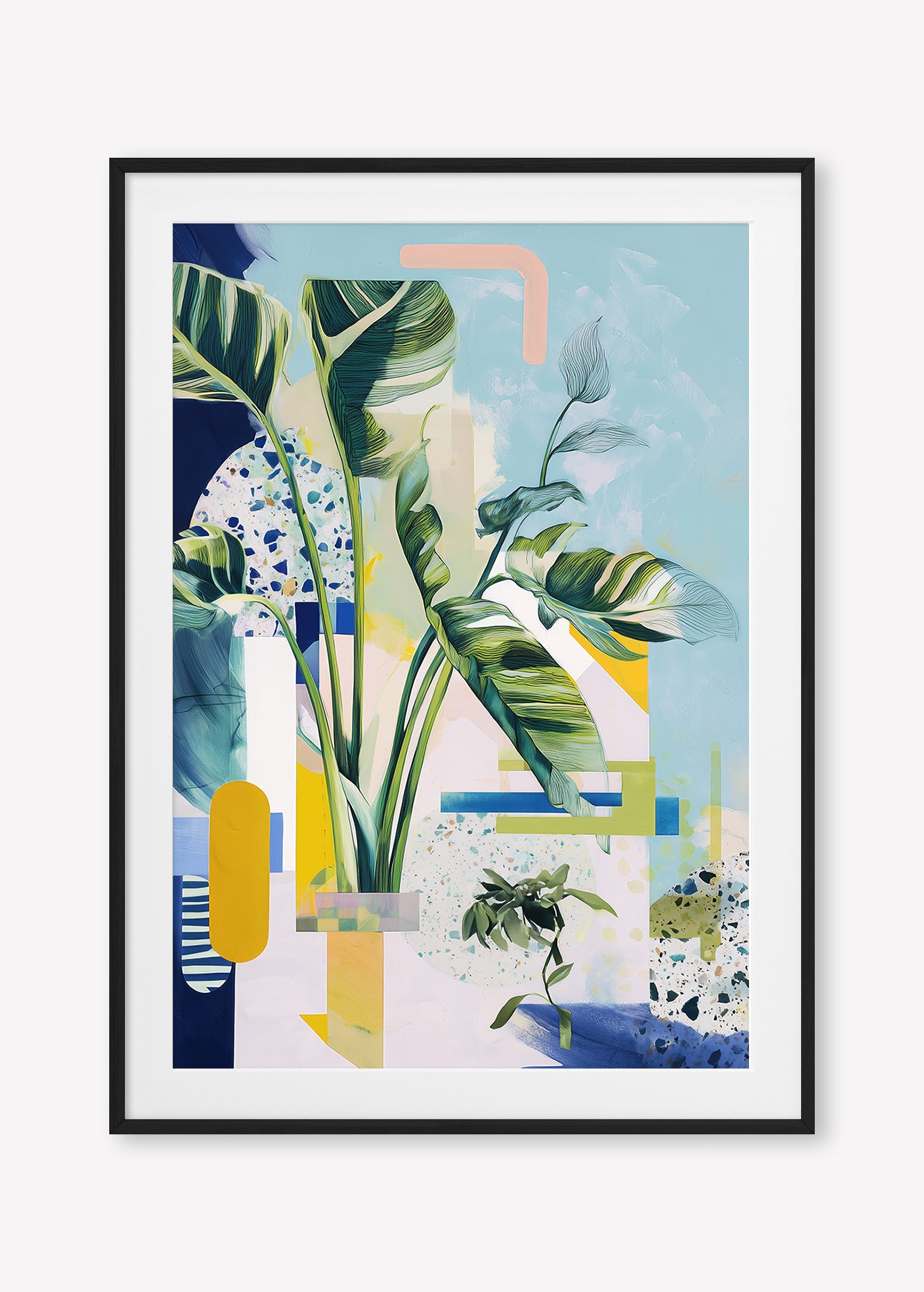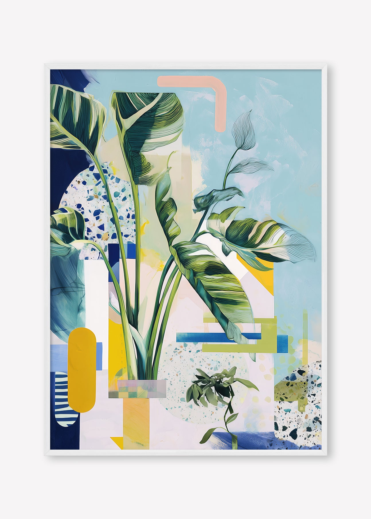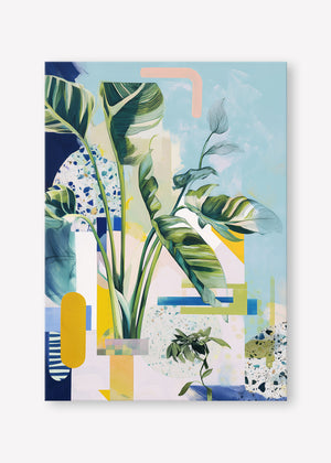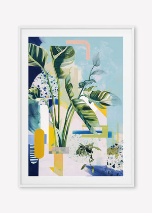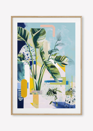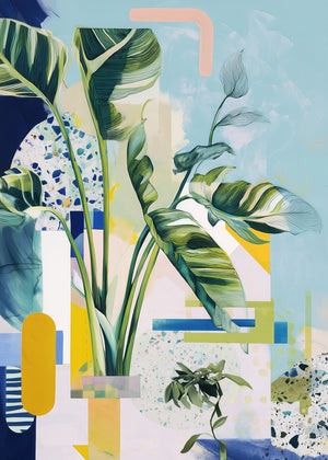 A stylised birds of paradise and terrazzo textures blend with abstract shapes in a cool, balanced composition.