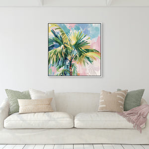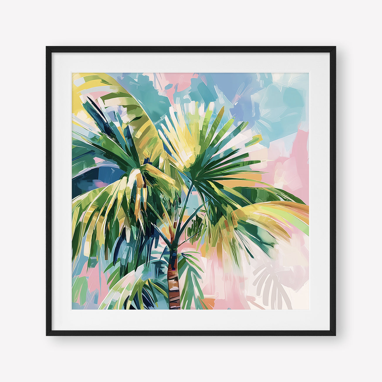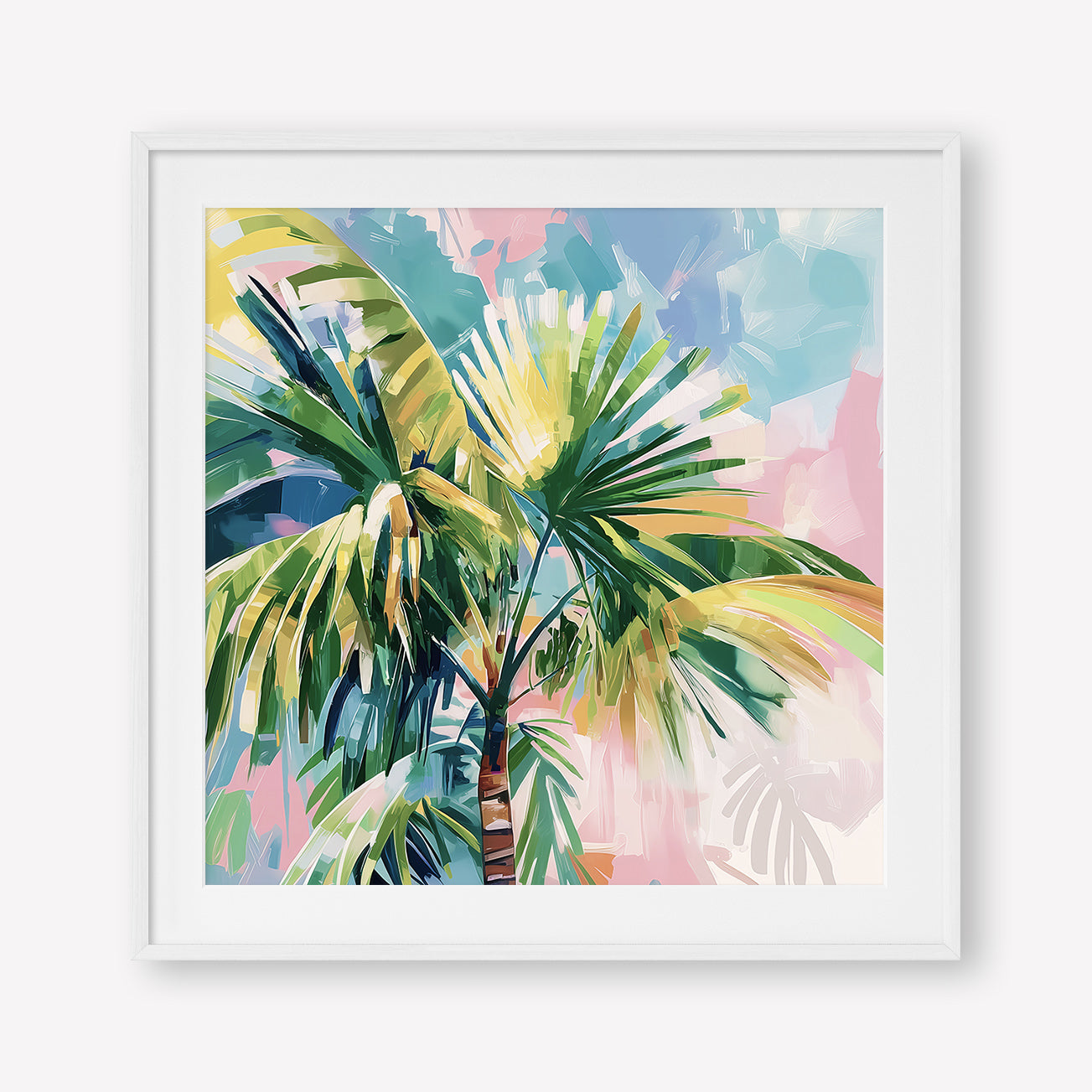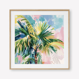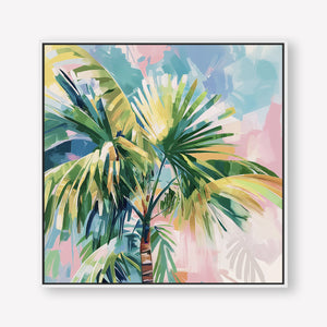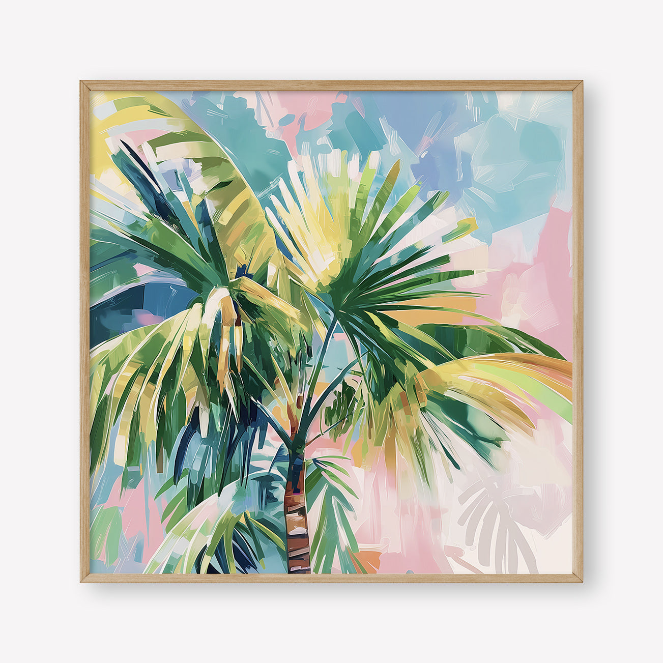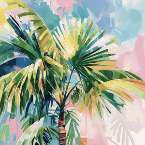 Vibrant brushstrokes capture the light filtering through stylized palm leaves against a soft, dreamy sky.